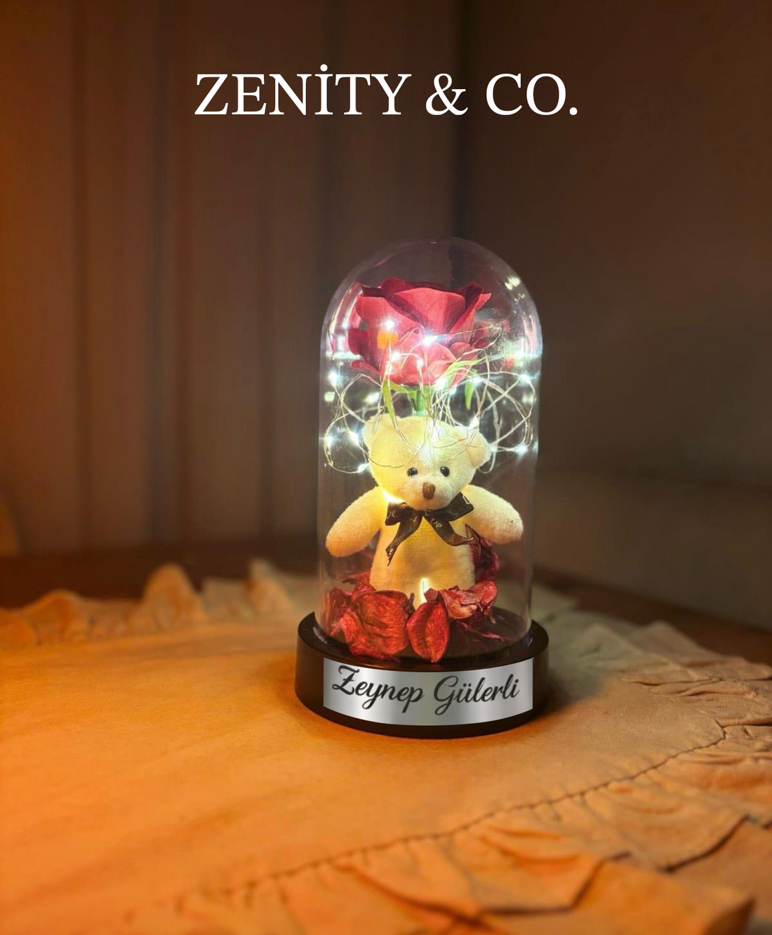 İsimli Ayıcıklı Işıklı Gül Fanus